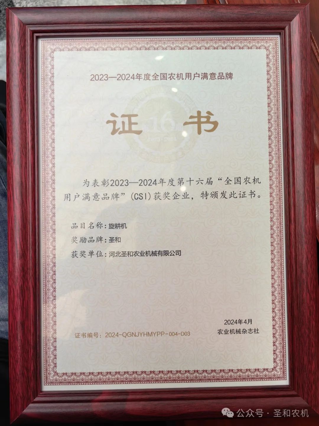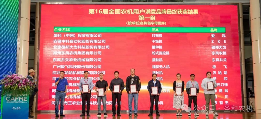 2024年4月27日,“2024 第二屆農(nóng)機(jī)品牌大會(huì)”在浙江永康隆重召開。在“2023—2024年度第16屆全國農(nóng)機(jī)用戶滿意品牌頒獎(jiǎng)儀式”上,圣和牌旋耕機(jī)再次蟬聯(lián)第十六屆全國農(nóng)機(jī)用戶滿意品牌大獎(jiǎng)。