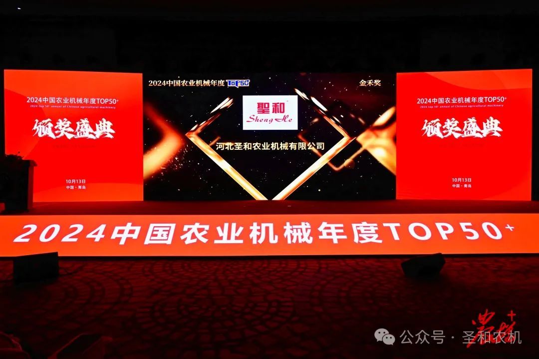 2024年10月12—14日,“2024第十二屆中國農(nóng)機(jī)高端論壇”在山東青島盛大召開。同期還隆重舉行了“2024 中國農(nóng)業(yè)機(jī)械年度 TOP50+”頒獎(jiǎng)典禮,在頒獎(jiǎng)典禮上圣和品牌再次蟬聯(lián)“金禾獎(jiǎng)”殊榮。