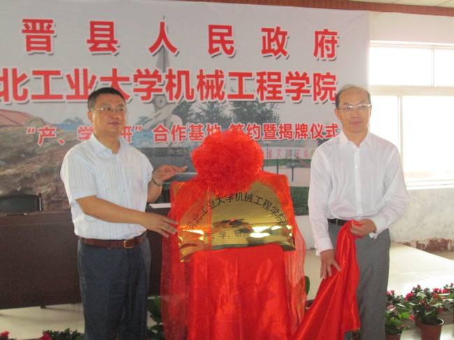 2013年6月8日,河北工業(yè)大學(xué)機(jī)械工程學(xué)院產(chǎn)、學(xué)、研合作基地簽約暨揭牌儀式, 學(xué)院黨委書記張成德、戴士杰副院長(zhǎng)、副縣長(zhǎng)攸超、縣工信局白志芬局長(zhǎng)、大陸村鎮(zhèn)黨委書計(jì)蔡侗江、鎮(zhèn)長(zhǎng)宋瑞剛一同出席了揭牌儀式.