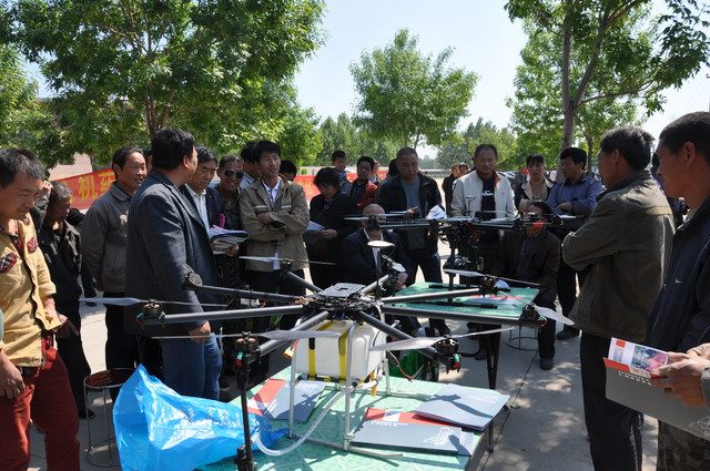 5月5日,我公司與西安鯤化聯(lián)合研制的無人植保飛機在晉州登場亮相,此次參觀試驗的有晉州市劉市長、石家莊市植保站王維蓮站長、我公司董事長王新芳、威遠生化植保營銷中心總經(jīng)理應(yīng)曉東等公司領(lǐng)導(dǎo)及當?shù)卮迕窈秃献魃?0多人觀摩;在本次試驗會上,展示的無人飛機一個用于小麥藥效防治工作、一個用于全程跟蹤航拍工作。
