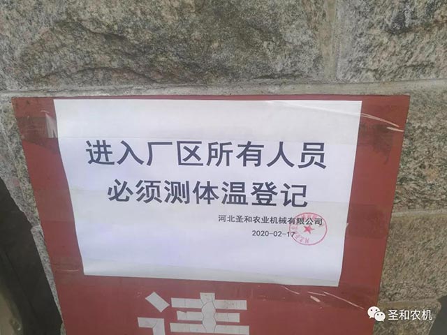 河北圣和農(nóng)業(yè)機(jī)械有限公司嚴(yán)格遵守各級(jí)政府的疫情防控安排,嚴(yán)格做好復(fù)工前的準(zhǔn)備工作。主要措施如下:1、成立疫情防控領(lǐng)導(dǎo)小組,逐級(jí)建立防疫工作組,層層防控。2、通過網(wǎng)絡(luò)、宣傳版與電子大屏播放等多種手段,宣傳貫徹防疫制度與防疫知識(shí),加強(qiáng)員工的監(jiān)督與管理。3、在公司門口建立二十四小時(shí)值班的疫情防控點(diǎn)、應(yīng)急隔離室、嚴(yán)格限制外來人員與車輛進(jìn)入廠區(qū),建立職工每日排查制度。4、統(tǒng)計(jì)與購買防疫物資:口罩、防護(hù)眼鏡、橡膠手套、消毒酒精、洗手液等,每個(gè)車間配備廢棄口罩收集桶、消毒酒精、洗手液等個(gè)人防護(hù)用品。5、每天對(duì)全廠區(qū)、全覆蓋進(jìn)行消毒殺菌。6、建立健全防疫規(guī)程和制度。制定了完備的錯(cuò)時(shí)上下班、每天的體溫監(jiān)測、分散就餐制度等,減少人員聚集,加強(qiáng)室內(nèi)通風(fēng)。7、建立針對(duì)員工發(fā)燒、乏力、干咳、呼吸困難等癥狀的應(yīng)急預(yù)案,隔離措施與應(yīng)急交通送醫(yī)路線、定點(diǎn)醫(yī)院聯(lián)系等預(yù)案。