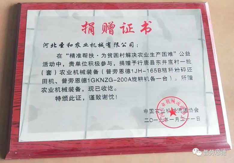 3、2019年12月21日,在“精準(zhǔn)幫扶·為貧困村解決農(nóng)業(yè)生產(chǎn)困難”公益活動中,河北圣和農(nóng)業(yè)機械有限公司捐贈予行唐縣東井底村普勞恩德1JH-165B秸稈粉碎還田機、普勞恩德1GKNZG-200A旋耕機各一臺。