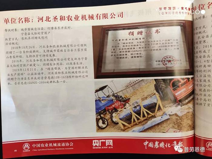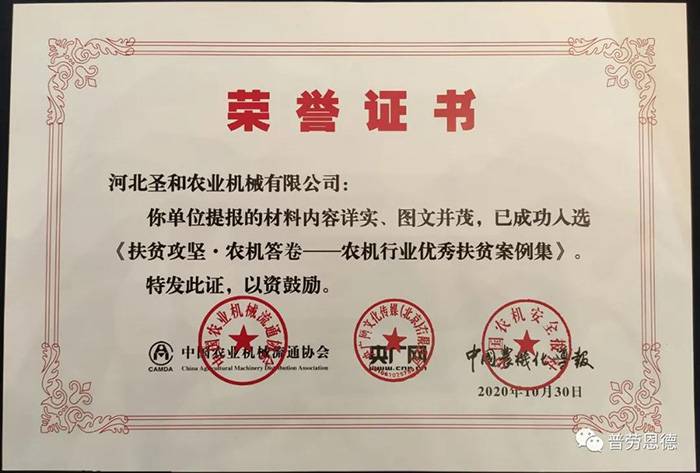 《農機行業(yè)優(yōu)秀扶貧案例集》入選案例榮譽證書頒發(fā)儀式同期舉辦!河北圣和是唯一入選的河北生產企業(yè)!