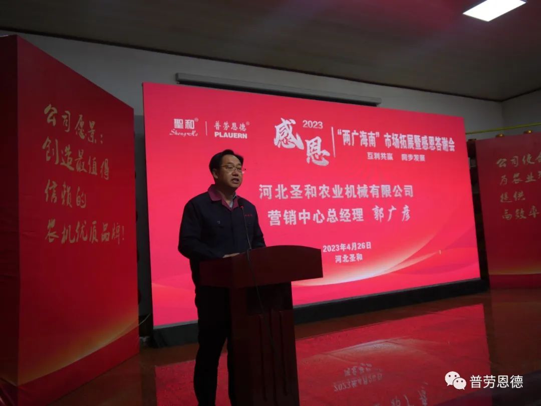 2023年4月26日,圣和公司歡聲笑語(yǔ),春意盎然。以“互利共贏,同步發(fā)展”為主題的河北圣和“2023年兩廣海南市場(chǎng)拓展暨感恩答謝會(huì)”在河北圣和農(nóng)業(yè)機(jī)械有限公司盛大舉行。100余位來(lái)自廣東、廣西、海南的經(jīng)銷商會(huì)師圣和,共襄盛舉。